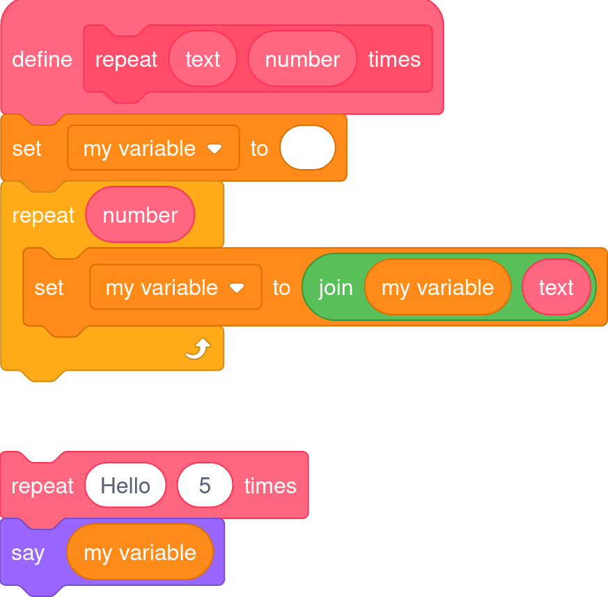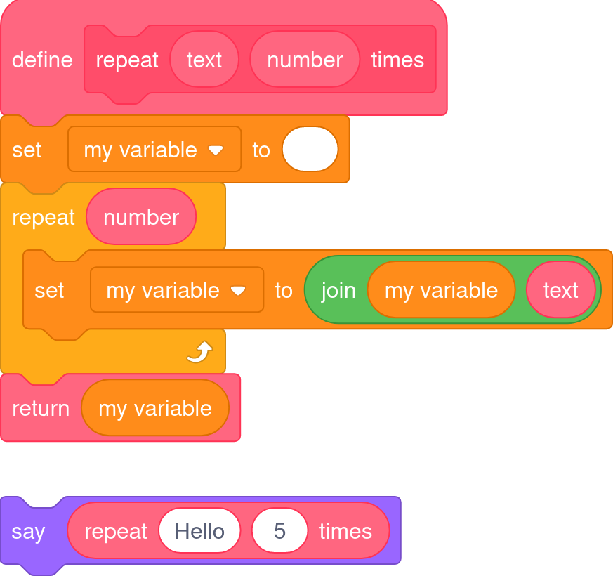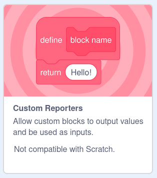 Dash supports custom reporters which lets you use any custom block in your project as a reporter, like the addition block built into Scratch. This is a pretty standard feature in text-based programming languages, but it can be hard to understand initially.