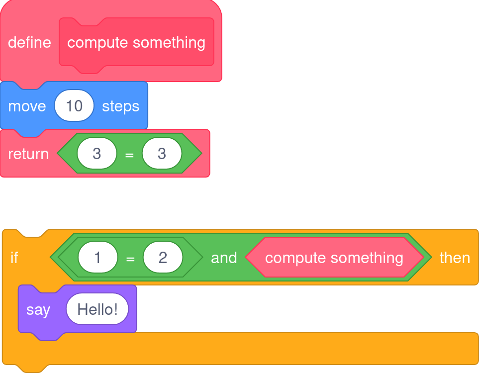 To improve performance, the compiler has a feature known as short circuiting. Imagine a Scratch block like "< (1 = 2) and (3 = 3) >". When the compiler sees this block, it first evaluates "1 = 2", which is clearly false. In this case, the compiler doesn't even need to check the other side of the "and" block as it won't matter: the final result will always be false. Typically this is just free performance, but if your blocks have side effects such as moving sprites, different behaviors will occur as the interpreter always evaluates all blocks. Try this script to see: